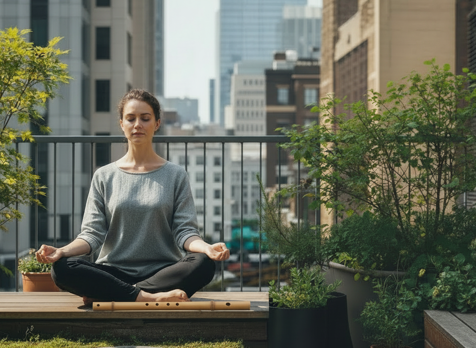 Diferencial importante desta abordagem é o uso da flauta de bambu japonesa (Shakuhachi), cujo timbre suave serve como âncora de atenção: ajuda a desacelerar, regula a respiração e cria um ambiente de serenidade que facilita a prática — menos dispersão e mais presença.